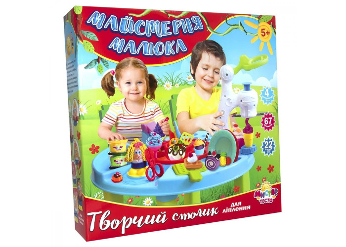 Набір для творчості «Майстерня малюка» яскравий і привабливий набір-столик, відмінний і потрібний подарунок дитині, також зручне місце для занять ліпленням. Сама поверхня збірного столика містить в собі велику кількість формочок, також має кріплення для установки кухонного приладдя. У набір входить тісто для ліплення, яскраве, нетоксична, воно не липне і не забруднює рук. Юні кондитери зможуть виліпити з маси будь-які ласощі, а якщо врахувати, що в наборі є і морозивниця - неповторні десерти. Для сервірування столу передбачений весь комплект - тарілочки, стаканчики, виделки і ложечки. Крім того, в наборі є все необхідне не тільки для кулінарів, але і для маленького стиліста і перукаря. Прес, для виготовлення стильних аксесуарів і зачіски, забавні фігурки, яким за допомогою приладдя дитина зможе надати креативний зовнішній вигляд. На чоловічках юний дизайнер зможе проводити творчі експерименти без обмежень. Все що потрібно для радісного проведення часу, розвитку посидючості це фантазія і бажання.