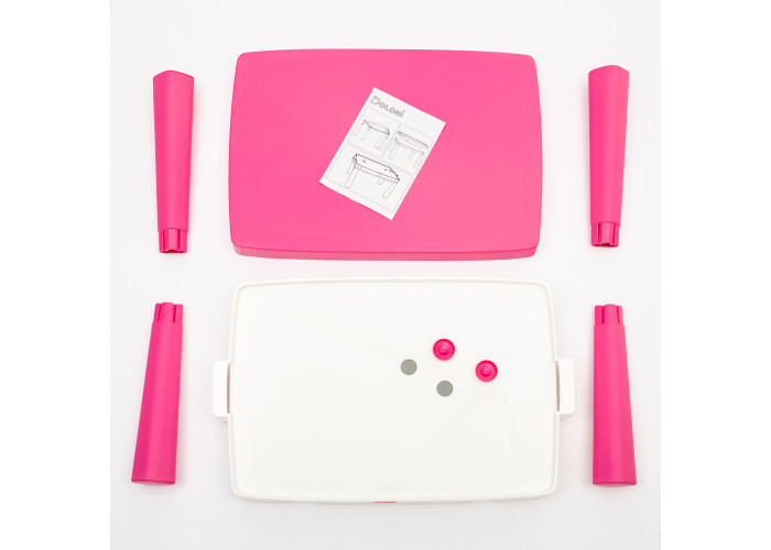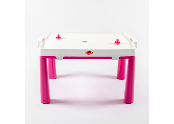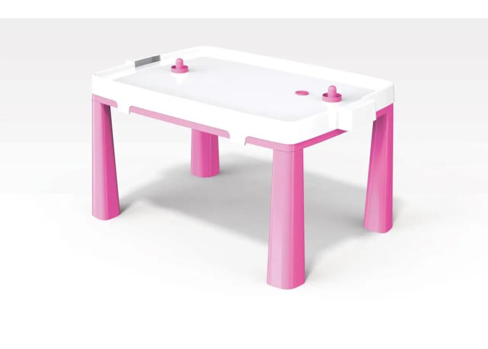 Столик виготовлений з міцного пластику, який має високу стійкість до деформації, тому збереже початковий вигляд протягом тривалого часу. Його можна використовувати як звичайне робоче місце для занять навчанням або творчістю. Але варто тільки зверху встановити спеціальну накладку і він перетворюється в поле для аерохоккея.