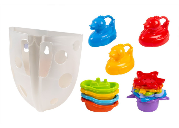 Всі іграшки запаковані у спеціальний органайзер, який є відмінним поєднанням функціонального контейнера для зберігання у ванній кімнаті та цікавої іграшки. Іграшки в органайзері зручно промити під протічною водою та прикріпити на стіну. Завдяки отворам вода швидко стікає та іграшки добре висихають. При такому зберіганні вони не пліснявіють, не забруднюються, та завжди під рукою.