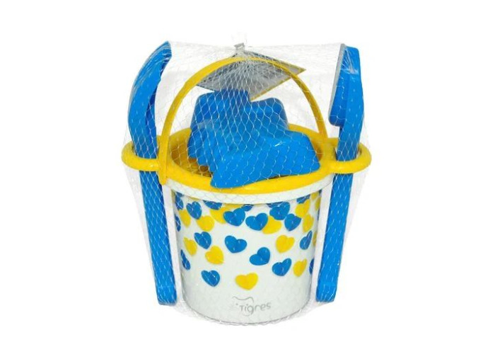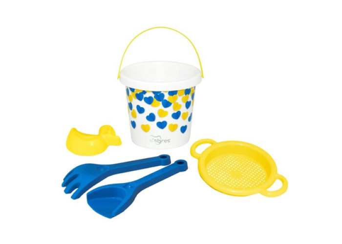 Набір для піску Tigres Українське серце — відмінний комплект для ігор на вулиці у пісочниці чи на пляжі. У набір входять: цебро 1 л; ситечко; лопатка; граблі; Форма для піску. Крім того, зручне цебро з ручкою універсальна іграшка на всі пори року, адже в ній можна переносити іграшки, деталі конструктора та інші предмети. Всі елементи виготовлені із міцних, якісних, стійких до погоди матеріалів, які є абсолютно безпечними для малюків. Зображення нанесене на цебро за допомогою сучасної технології IML, що робить їх виключно довговічними, навіть при тривалому контакті з водою та піском.