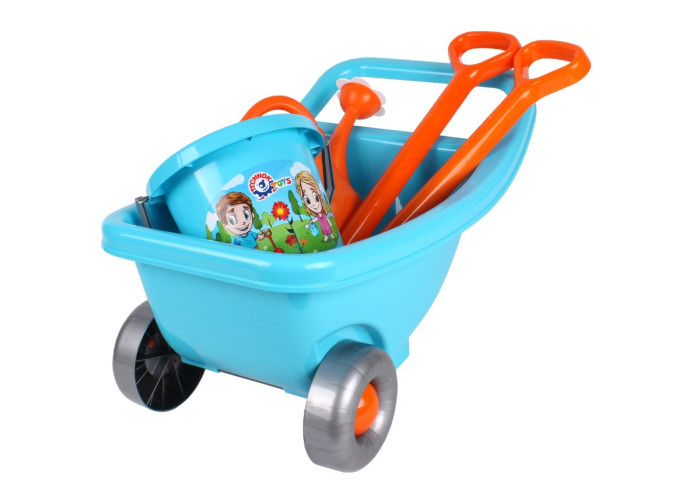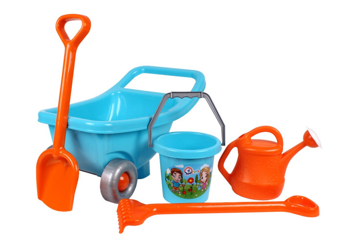 У наборі: тачка, лійка, відерко, лопата та граблі.