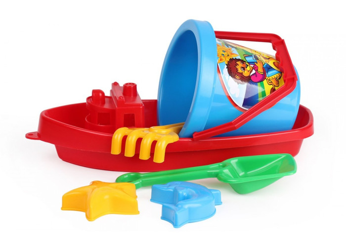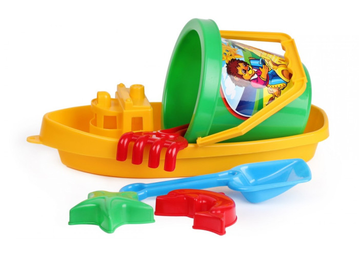 Набір з кораблика, відерка з яскравим малюнком, лопаток, грабельок та 2 формочок для піску.