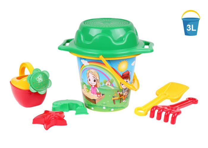 У набір для гри в піску входять: відро, сито, формочки, лопатка, грабельки і лієчка.