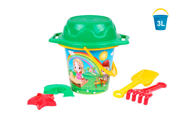 У набір для гри в піску входять: відро з малюнком IML, сито, лопатка, грабельки та 2 формочки.