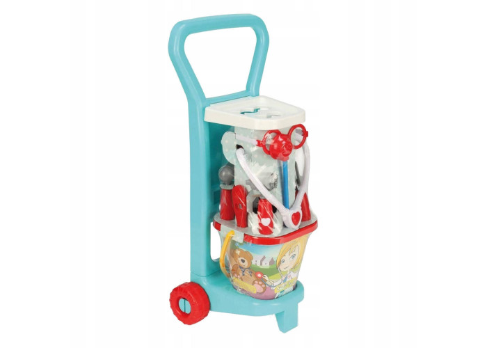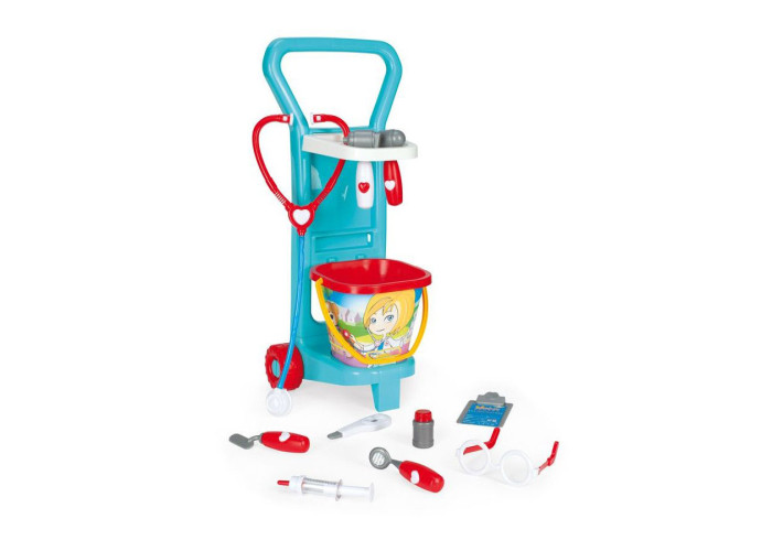 Ігровий набір для юного лікаря представляє собою візок з відром, підставкою для інструментів і безпосередньо набором інструментів лікаря. Зберігати і перевозити інструменти зручніше в відрі (у нього передбачена кришка), а при огляді пацієнта стане в нагоді підставка. Іграшковий набір розрахований на юних лікарів старше трирічного віку. Візок оснащений великими колесами і високою, зручною, закругленою ручкою. Візок рухається легко, але при необхідності стоїть стійко, спираючись на колеса і уступ внизу. Обсяг відра на візку - 2 літри. Відром, крім зберігання в ньому лікарських предметів, можна грати окремо. Такий комплект (візок з відерцем) стане в нагоді при багатьох дитячих іграх.