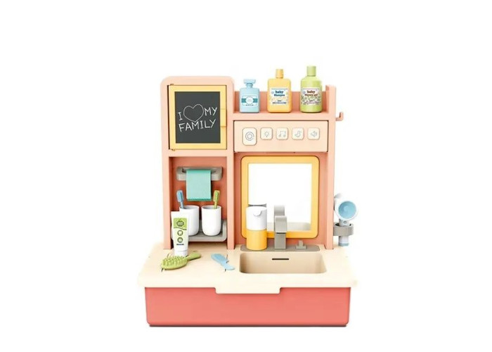Дитячий ігровий набір з умивальником та засобами гігієни Дитячий ігровий центр «Доброго ранку» чудово підійде для сюжетно-рольових ігор як дівчинки, так і хлопчика. Гра з ним допоможе привчити дитину до чистоти та порядку. Ігровий центр є куточком, в якому дитина зможе розігрувати сценки проведення щоденних водних та гігієнічних процедур. Допоможуть у цьому раковина з крану якої циркулюючи тече справжня вода, велике дзеркало, різноманітні тематичні ігрові предмети. На крейдяній дошці дитина зможе намалювати щось, що піднімає настрій. Інтерактивна багатофункціональна панель на центрі містить блок кнопок: увімкнення/вимкнення, підсвічування, веселі мелодії, звуки тварин, регулювання гучності. Світлові та звукові ефекти, реалізовані в цьому наборі, внесуть до ігрового процесу додаткову привабливість.