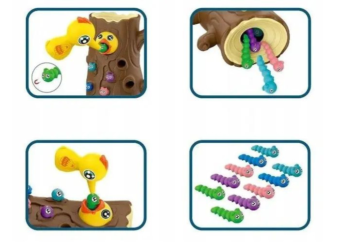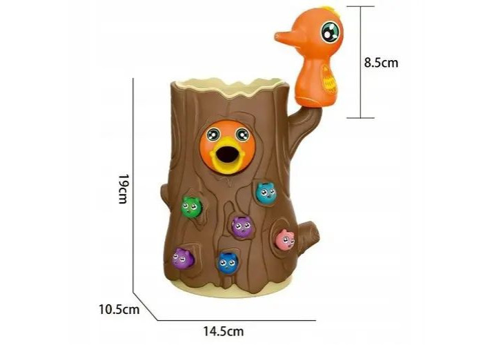 Захоплююча дитяча магнітна гра "Нагодуй дятлика" У дулі масивного дерева живуть 9 довгих черв'ячків. Бережної мами – пташки необхідно витягнути черв'ячка за допомогою спеціального магнітика на дзьобі та нагодувати свого голодного малюка. Всі ігрові елементи виготовлені з первинного пластику та пофарбовані високоякісними фарбами, які є абсолютно безпечними для малюків.