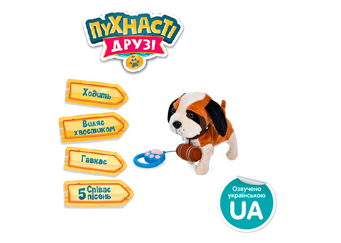 Ця музична плюшева собачка Сенбернар, яка ходить, стане справжнім другом для вашої дитини. Ваш малюк зможе навіть вигулювати її, з допомогою повідця, який слугує як пульт керуванння для іграшки за допомогою якого можна взаємаодіяти з собачкою.