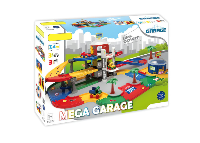 Іграшковий паркінг Mega Garage - це сучасна, легка і проста у складанні конструкція, яка дозволяє збирати різні траси і забезпечить вашій дитині багато годин цікавої гри і радості. До складу набору входять: система доріг загальною довжиною 7,4 м, 3-поверховий гараж з ліфтом, 3 транспортні засоби Kid Cars, наклейки і декорації (знаки, пальми, білборди). Набір дозволяє придумувати багато сценаріїв ігор, розвиває уяву дітей і спонукає до креативності. Ігри набором покращують руховий розвиток наймолодших, особливо дрібної моторики, їх мануальні здібності, точність рухів і зорово-моторну координацію, навчають логічного мислення і просторової орієнтації. Різнокольорові елементи сприяють вивченню основних кольорів. Під час гри дитина знайомиться з принципами дорожнього руху, а також вчиться як безпечно переходити дорогу. Всі елементи виготовлені з високоякісного безпечного і міцного матеріалу, завдяки чому всі частини траси зберігатимуть вигляд і колір протягом багатьох років. Набір упакований в гарну коробку, ідеальну на подарунок.