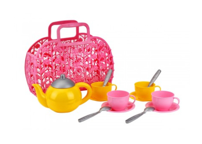 Кошик з набором посуду від ТехноК представляє яскравий пластиковий чайний сервіз для чотирьох, що складається з 13 елементів (чашки, блюдця, чайні ложечки, чайник). Ефектна сумочка-кошик виконана у малиновому кольорі.