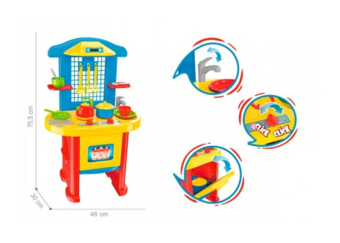 Висота кухні у зібраному вигляді 75,5 см, а ширина стільниці 48 см. У широкій стільниці зручно грати двом, а то й трьом дітям.