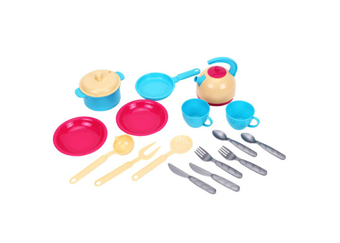 У комплект посуду входить: сковорідка, чайник, каструля з кришкою, 2 глибокі тарілки, 2 чашки, столові та кухонні прилади.