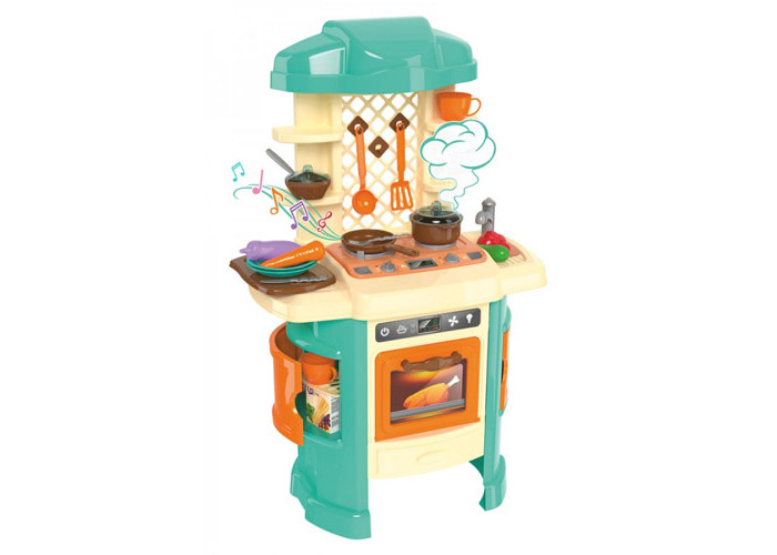 Набір дитячої кухні містить весь необхідний посуд для приготування смачних страв. Є каструлька з прозорою кришкою (з отворами для проходження пари), сковорідка , дошка для нарізки та яскраві овочі. Дві картонні коробочки зі спагетті та пластівцями для приготування корисних сніданків, а для чаювання - дві чашки з блюдечками та цукорниця.