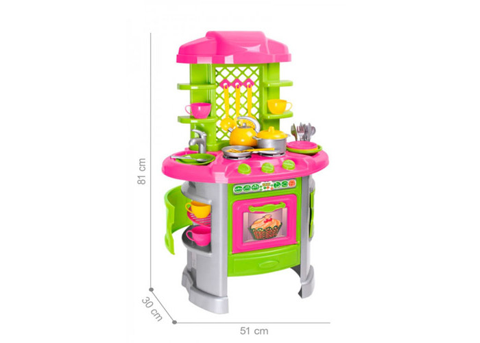 Оригінальні ніжки кухні з двома шафками роблять іграшку стійкою та дуже функціональною. Висота кухні в зібраному вигляді 81 см, а ширина стільниці 51 см. У широкій стільниці зручно грати двом, а то й трьом дітям.
