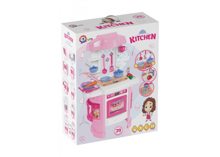 У наборі разом із іграшковою кухнею весь необхідний посуд для приготування смачних страв. Є каструлька із прозорою кришкою (з отворами для проходження пари), сковорідка, дошка для нарізки та яскраві овочі. Дві картонні коробочки зі «спагетті» та «пластівцями» для приготування корисних сніданків, а для чаювання – дві чашки зі блюдечками та цукорницею. А після смачного обіду – треба помити посуд. Для цього є мийка з краном та мочалка у формі квіточки.