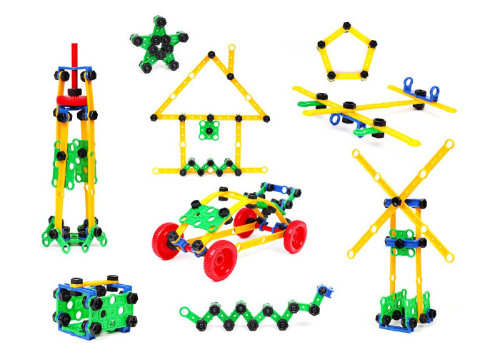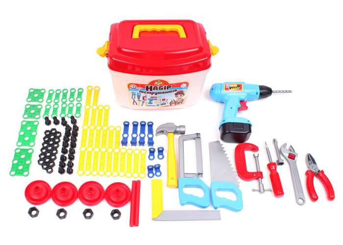 В новому наборі від ТехноК окрім «класичного» набору інструментів (молоток, пилочки, викрутки, плоскогубці та ін.) та дрилю є ще і конструктивні елементи – пластикові планки, кутники, пластини, гвинтики та гайки. Це чудова нагода для малюка вивчити принципи роботи різьбових з’єднань, що, безумовно, стане в нагоді в «дорослому» житті.