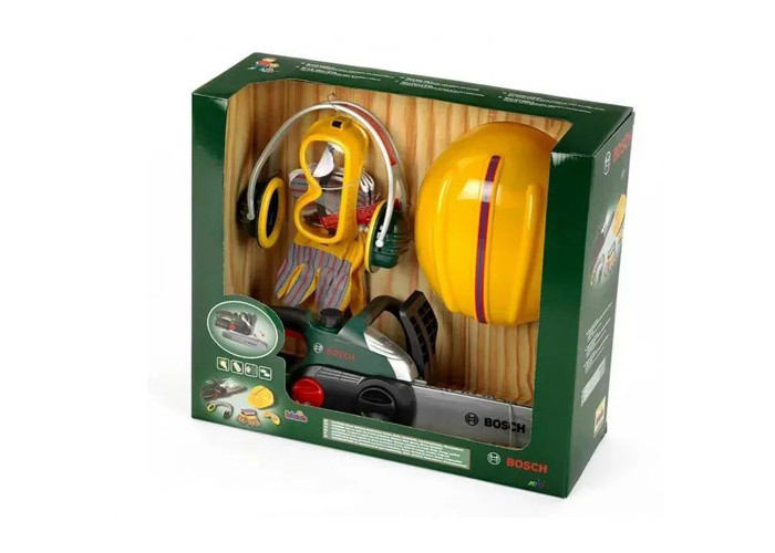 Бензопила Bosch с реалистичным звуком пиления и фонариком; Высококачественные детские рабочие перчатки стандартного размера; Рабочие очки с эластичным шнуром; Звукоизолирующие детские наушники стандартного размера; Шлем; Без батареек и аккумуляторов