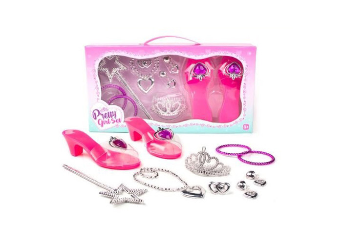 Набір аксесуарів буде чудовим подарунком для юної модниці. У наборі є модні черевички, чарівна паличка, сережки, кольє, тіару, браслети та гребінець. Розмір туфельок - 17х6 см.