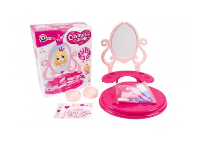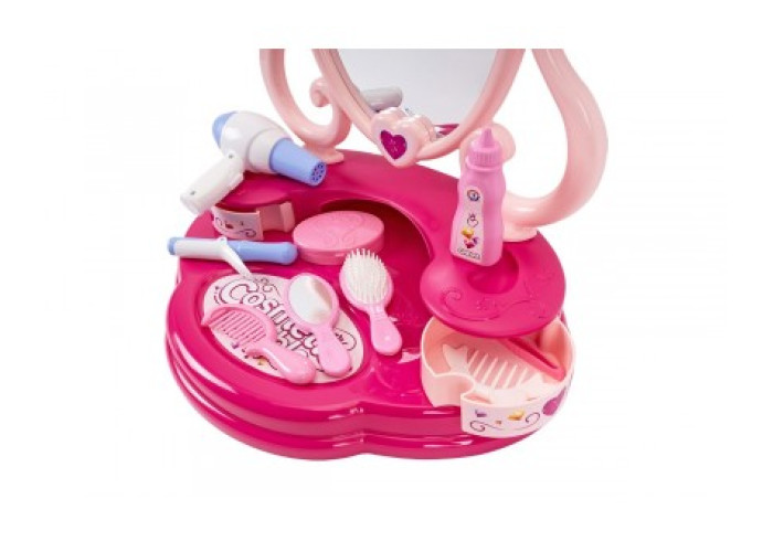 Цей стильний столик має велике наповнення, яке дозволяє Вашій дитині грати в стиліста або перукаря, робити зачіски та макіяж. В комплекті столика окрім трюмо є гребінець, щітка, дзеркальце, пінцет, заколка-гребінець, плойка, пудрениця, фен, тюбик крему - всього 9 аксесуарів.