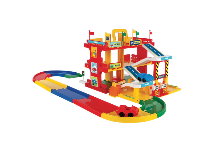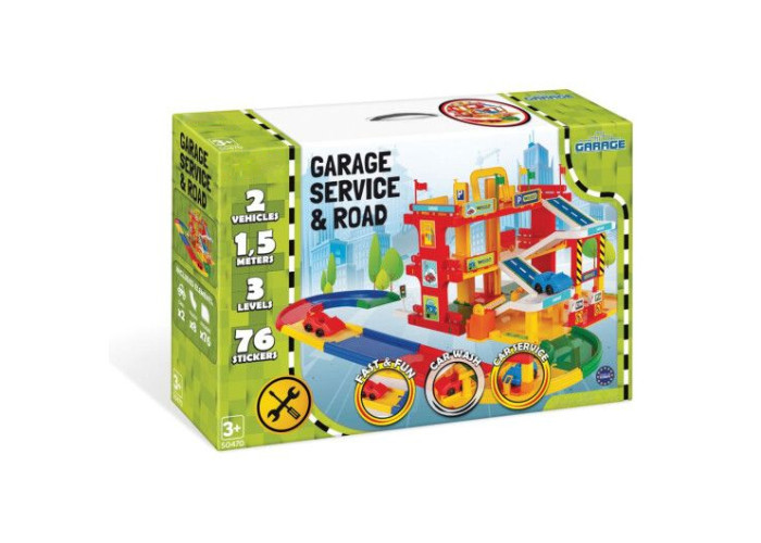 Сучасний, реалістичний гараж обладнаний ліфтом, що перевозить автомобілі на потрібний поверх, рампою, авто мийкою, автозаправкою, сервсом техобслуговування, численними декораціями і наклейками, 2 автомобілями та 1,5-метровою дорогою. Великою перевагою є яскравий, легкий і простий у монтажі дизайн. Набір дозволяє придумувати багато сценаріїв ігор, розвиває уяву дітей і спонукає до креативності. Ігри набором покращують руховий розвиток наймолодших, особливо дрібної моторики, їх мануальні здібності, точність рухів і зорово-моторну координацію, навчають логічного мислення і просторової орієнтації. Різнокольорові елементи сприяють вивченню основних кольорів. Всі елементи виготовлені з високоякісного безпечного і міцного матеріалу, завдяки чому всі частини траси зберігатимуть вигляд і колір протягом багатьох років. Набір упакований в гарну коробку, ідеальну на подарунок.