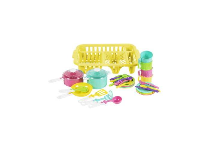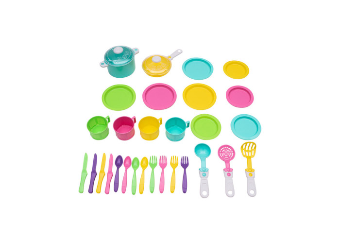 Іграшка складається з такого посуду: каструлі і сотейника з прозорими кришками, сковороди, 4 тарілки великі і 4 тарілки малі, лоток, 4 чашки, 4 ложки, 4 вилки, 4 ножа, лопатка, шумівка, картоплі-м'яльницю, ополоник, які вкладаються в пакет ПВХ і закривається за допомогою кольорового стікера. Деталі іграшки виготовляються методом лиття під тиском з поліпропілену і мають різні яскраві кольори.