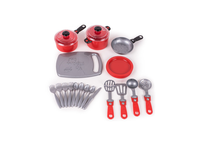 Набір предметів ігрового ужитку - набір посуду Iriska 3, довжина - 210 мм, ширина - 110 мм, висота - 180 мм, маса іграшки - 0,272 кг, споживча упаковка - пакет ПВХ. Іграшка складається з такого посуду: каструлі і сотейника з прозорими кришками, сковороди, 4 тарілки, кухонна дошка, 4 ложки, 4 вилки, 1 ніж, лопатка, шумівка, картоплі-м'яльницю і ополоник, які вкладаються в пакет ПВХ і закривається за допомогою кольорового стікера.