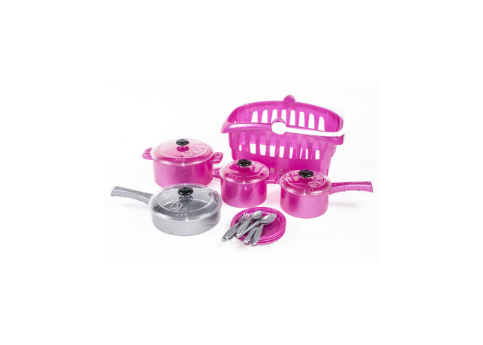 Набір предметів ігрового вжитку - набір посуду Кristinka 2, довжина - 295 мм, ширина - 190 мм, висота - 200 мм, маса іграшки - 0,650 кг, споживча упаковка - сітка полімерная. Іграшка складається з такого посуду: каструля велика і каструля мала з прозорими кришками , сковорода і сотейник з прозорими кришками, 4 тарілки, лопатка, шумівка, картопледавка і ополоник, 4 ложки, 4 вилки, 4 ножа, які вкладаються в кошик з ручкою і упаковуються в полімерну сітку.
