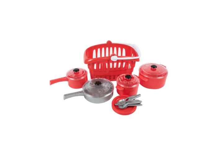 кастрюля большая и кастрюля малая с прозрачными крышками, сковорода и сотейник с прозрачными крышками, 4 тарелки, лопатка, шумовка, картофеледавка и половник, 4 ложки, 4 вилки, 4 ножа, которые вкладываются в корзину