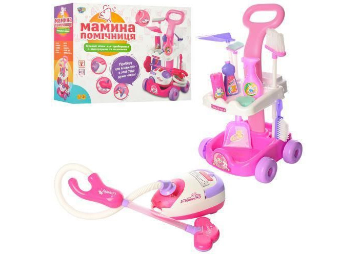 Дитячий ігровий набір містить все, що потрібно для справжнього прибирання: візок для прибирання, пилосос, швабра, щітка-мітла, відро, совок, щітка з короткою ручкою, губка, баночки миючих засобів. Всі предмети зручно розташовані у візку. На верхній частині пилососа велика кнопка: увімкнення/вимкнення. При включенні дитячий пилосос починає всмоктувати кульки, а сховані всередині пінопластові елементи задерикувато переміщаються у своєму відсіку, створюючи ілюзію збирання.