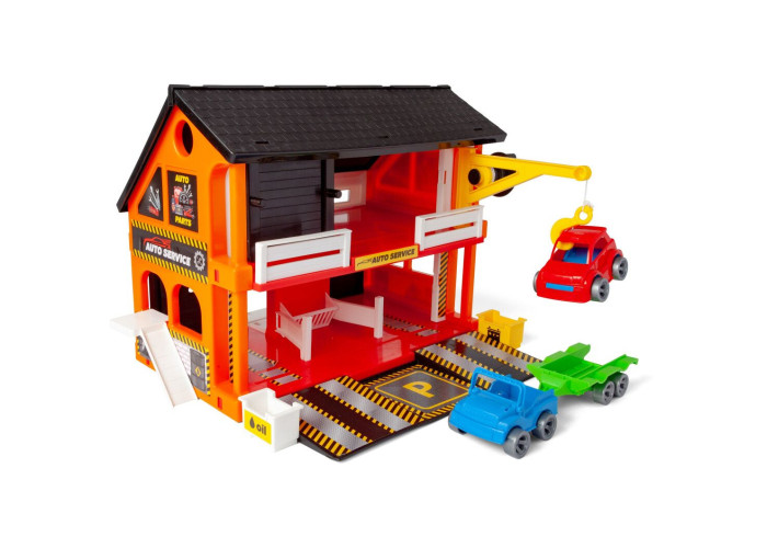 Play House Авто Сервіс – це двоповерховий будиночок з багатьма рухомими елементами такими як двері, ліфт, підіймач. У комплект входять також 2 автомобілі, під'їзди і комплект з 34 наклейок.