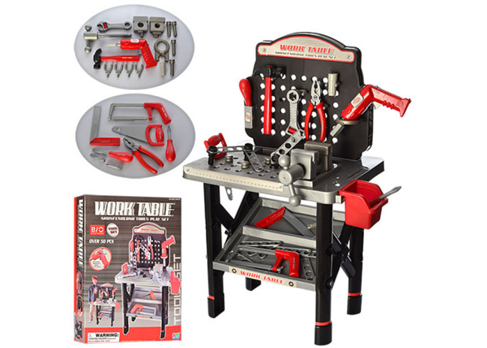 - великий робочий стіл з інструментами дуже сподобається хлопчикам;під столом і на його ніжках є полички для зберігання інструментів;