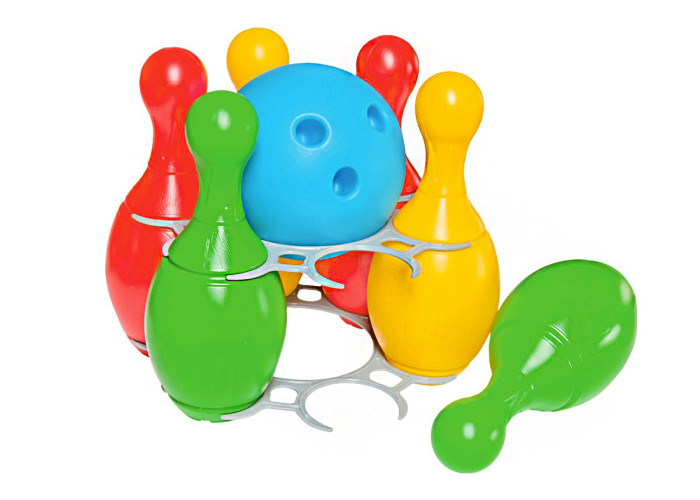 Комплект складається з набору яскравих різнокольорових кеглів та кулі. Якісний, стійкий до ударів пластик, з якого виготовлені кеглі і кулі, не втратить свій колір, не потріскається від ударів, зберігаючи надовго свій первісний вигляд. Всі складові елементи округлої форми, не мають гострих кутів і є абсолютно безпечними для дитини.