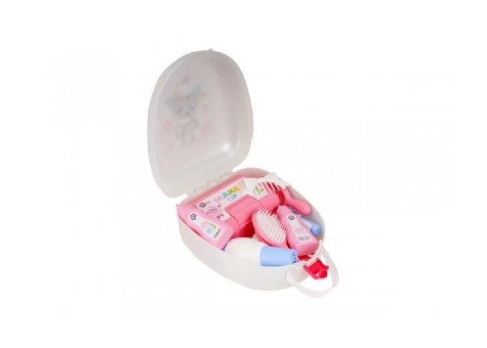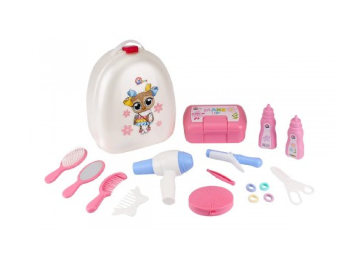 Комплектація: рюкзак, косметичка, плойка, фен, гребінець, щітка, дзеркало, ножиці, заколка гребінець, пудрениця, 4 резинки для волосся, 2 баночки з "кремом" і "шампунем", пінцет.
