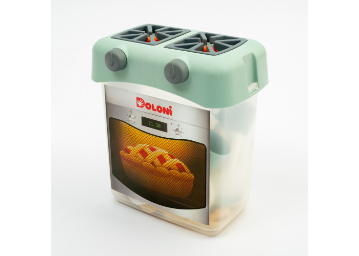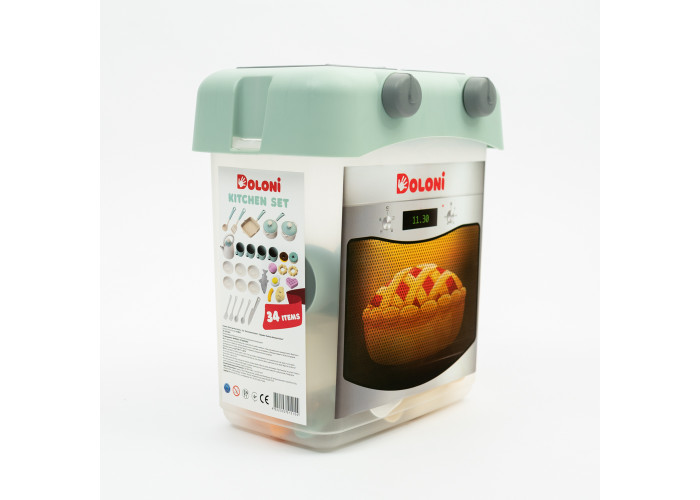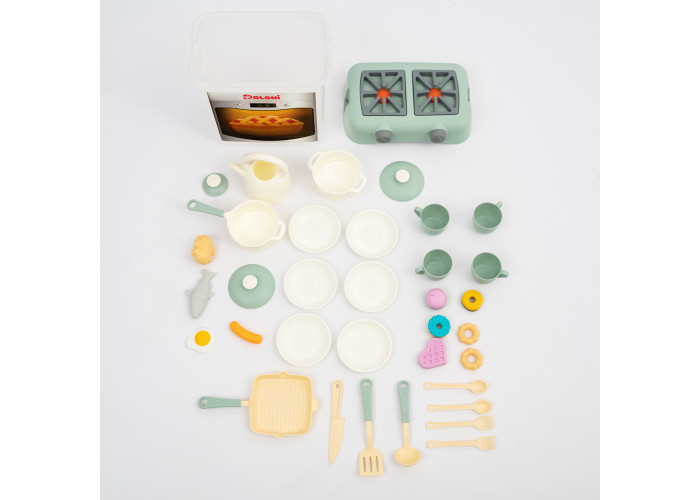 Комплектація: плита з 2-ма конфорками на панелі та 2 перемикачі; 34 елементи кухонних ігрових предметів; пластиковий бокс, прикрашений наклейкою духовки.