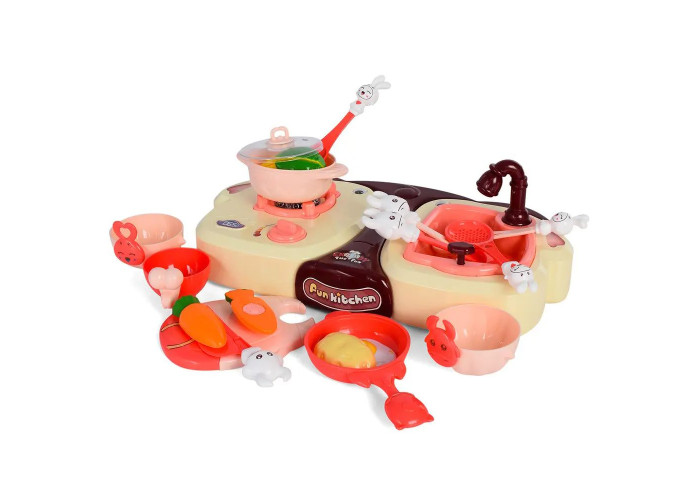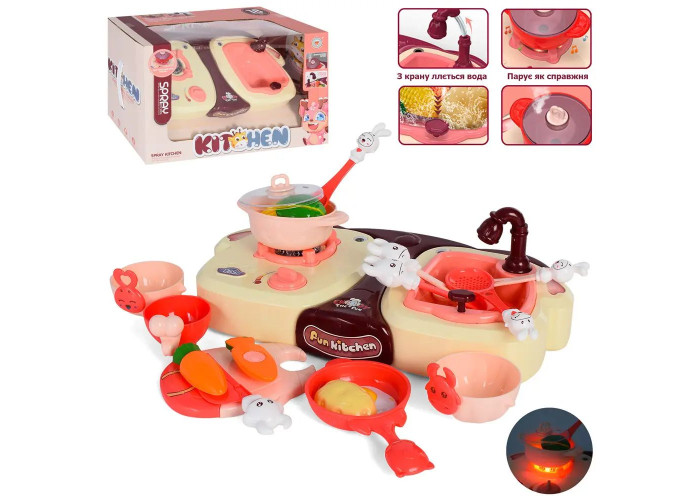 Кухня дитяча Мийка з краном та плитою – компактна кухонна зона для маленьких господинь, яка зацікавить та привчить до миття посуду та підтримання чистоти в будинку. Мийка укомплектована набором мініатюрного посуду та кухонних приладів, таких як тарілки, каструлі, сковорідки, ложки, вилки та навіть іграшкова їжа, яку можна мити, готувати та сервірувати.