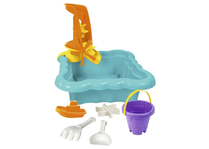 основа - лоток размером 36х36x12 см - элемент для крепления мельницы - мельница двухкомпонентная для песка и воды с пропеллером - ведерко "Башня" на 1 л - лопатка и грабли - пасочка - маленький кораблик
