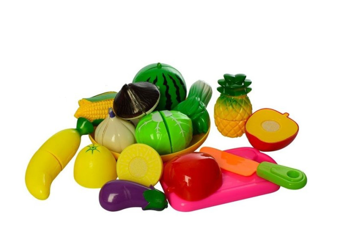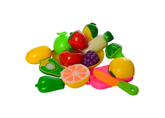 У наборі: 11 овочів і фруктів; ніж; дощечка; тарілка.