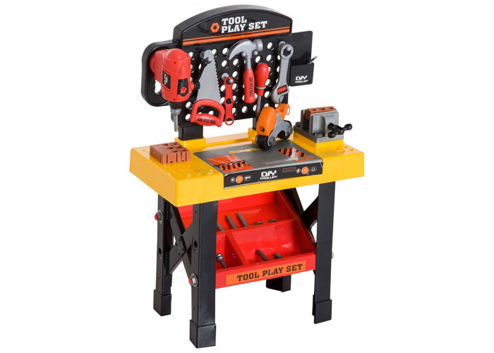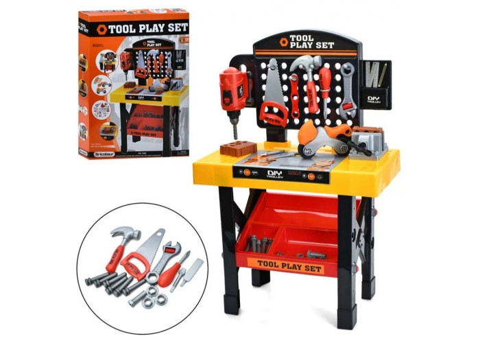 Маленький татовий помічник напевно оцінить цікавий ігровий набір Майстерня з інструментами. У комплект входить зручна стільниця з лещатами і вертикальною панеллю, на якій можна розмістити будівельні інструменти, а також молоток, викрутка, пасатижі, гайковий ключ, ліней , гайка, три шестерні. У самій стільниці є отвори для болтів і шестерні, так що ігровий набір певною мірою виконає роль сортера. На зручній поличці знизу можна розмістити готові деталі або прилади, які потребують термінової допомоги юного майстра на всі руки. Майстерня з інструментами - набір, який спритно потренує дрібну моторику та координацію рухів малюка, підкаже варіанти цікавої гри та дозволить дитині будь-якої миті зайнятися разом з татом домашніми справами. У комплекті: 19 елементів.