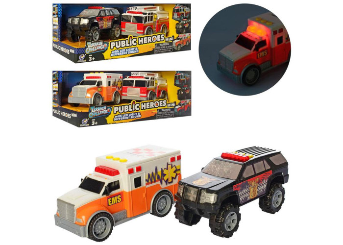 Набір з двох машин "спецслужби" Відмінний подарунок для малюка у святковий день. З цим комплектом можна наочно показати дитині роботу та функції певної служби порятунку. Кожна машинка має три кнопки, при натисканні на які відбуваються звукові і світлові ефекти.