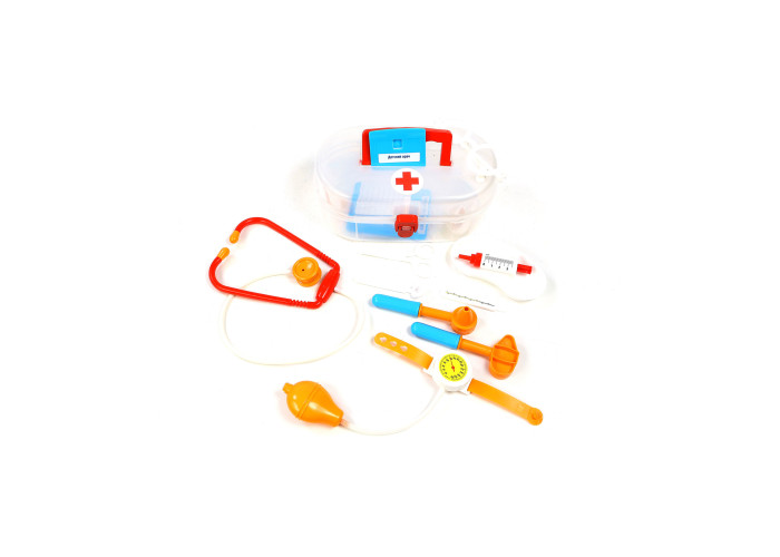 Медичні предмети такі: фонендоскоп, прилад для вимірювання тиску - тонометр, медичний молоток, воронка оглядова, медичний лоток, шприц, ножиці, термометр, оглядове дзеркальце, окуляри, картка хворого і бейджик. Фонендоскоп складається з трубки, еластичної трубки, двох дуг фонендоскопа та двох навушників. Прилад для вимірювання тиску складається з тонометра з ремінцем, еластичної трубки та груші. Медичний молоток та воронка оглядова складаються з двох частин — ручки та самого молотка та воронки. Шприц медичний складається з трьох частин – корпусу, поршня та наконечника. До картки хворого можна прикріпити олівець, а бейджик дитячого лікаря до медичного халата. Деталі набору виготовляються методом лиття під тиском із поліпропілену, груша – екструзійно-видувним методом із поліетилену низького тиску.