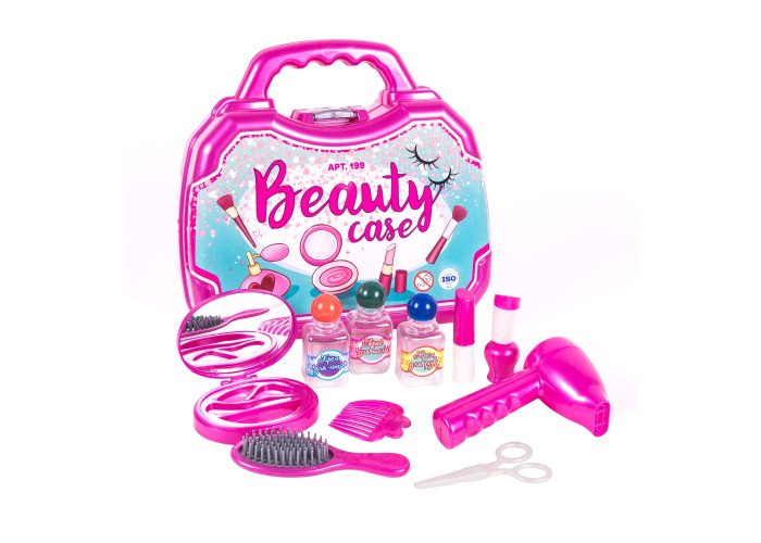 Чемодан-1 шт., расческа-1 шт., помада-1 шт., кисточка для лака-1 шт., флакон для лака-1 шт., щетка 1 шт., ножницы-1 шт., косметичка-1 шт. , флакон прозрачный – 3 шт., фен-1 шт.