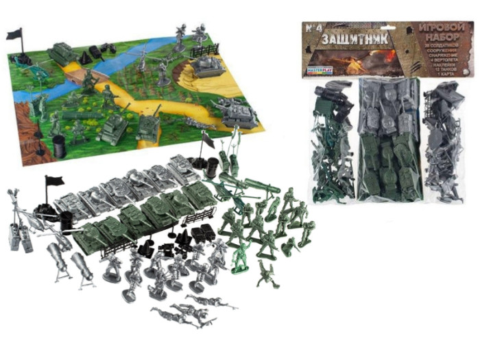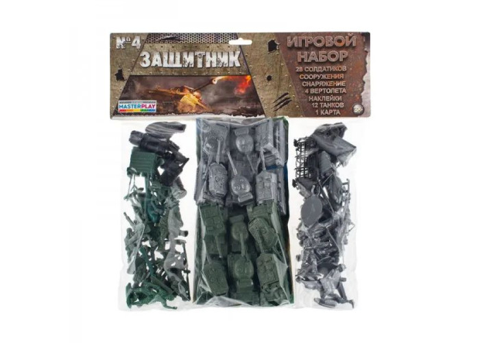 Солдатики "Захисник" No4 цей набір буде чудовим подарунком для будь-якого хлопчика! Великий комплект, що складається з армії навчених і чудово екіпірованих солдатів, 12 потужних танків, вертольотів, будівель, різного спеціалізованого спорядження та карти дозволить провести блискучу військову кампанію, не залишивши жодного шансу на перемогу противнику.