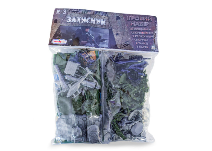 Солдатики "Захисник" No3 цей набір буде чудовим подарунком для будь-якого хлопчика! Великий комплект, що складається з армії навчених і чудово екіпірованих солдатів, 12 потужних танків, вертольотів, будівель, різного спеціалізованого спорядження та карти дозволить провести блискучу військову кампанію, не залишивши жодного шансу на перемогу противнику.