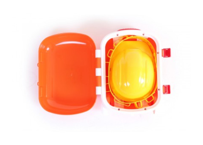 Також у «чарівній» валізі маленького майстра знайдеться зручний пояс зі спеціальними кишенями для інструментів і каска, яка дуже схожа на каску дорослих будівельників.