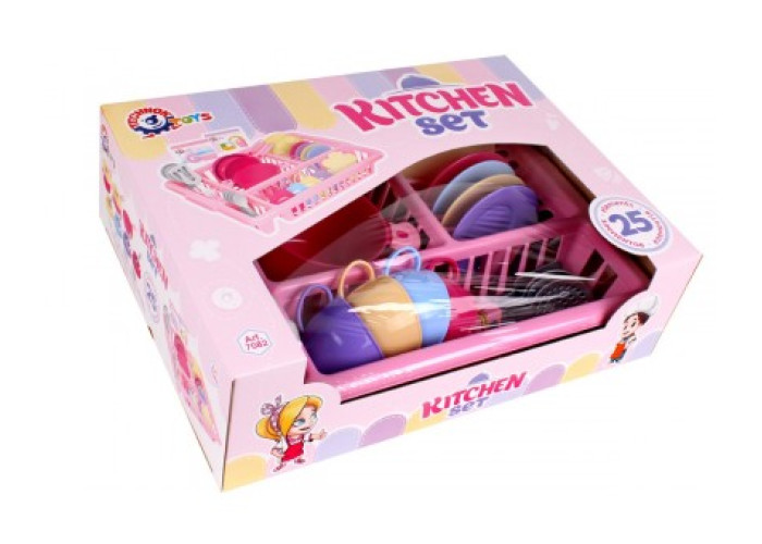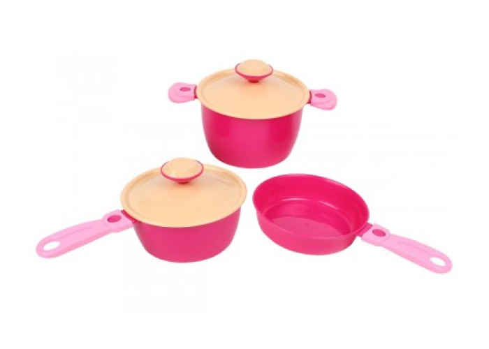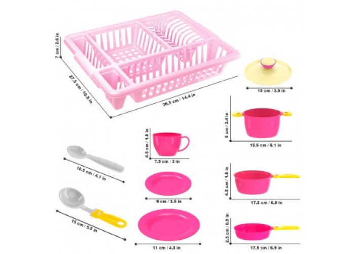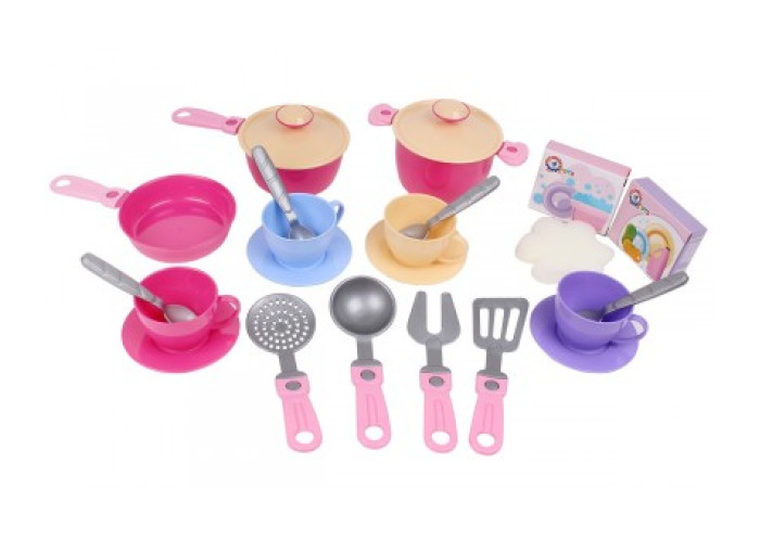 У наборі є все, щоб маленька господинька реалізувала свої кулінарні задуми. Каструлька та сотейник для смачних борщів та корисних овочів, сковорідка для смаження. Шумівка, черпак, велика виделка та лопатка зроблять процес приготування максимально реалістичним. Також малеча зможе запросити друзів на чаювання з різнобарвними горнятками на блюдечках.