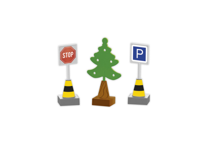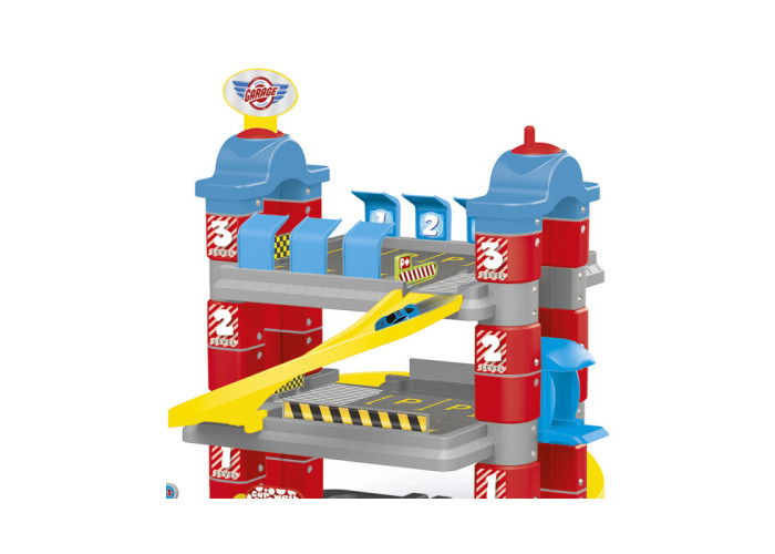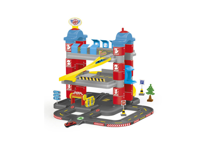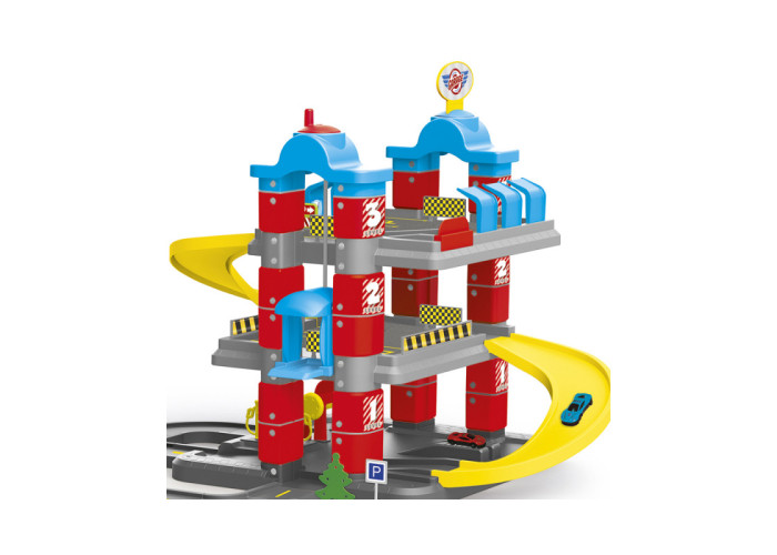 Великий трирівневий паркінг обладнаний дорогою з кільцевим рухом, круговими з'їздами, ліфтом для машинок, розміткою сервісу технічного обслуговування, автомийкою, бензоколонками, знаками дорожнього руху, розміткою та шлагбаумами. Також у комплекті йдуть дві машинки та багато наклейок.