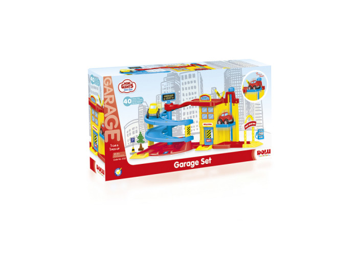 На другий рівень гаража машинки зможуть підніматися за допомогою ліфта, при в'їзді встановлено шлагбаум. Виїжджати зі стоянки можна гвинтовим треком, для зручності автомобілістів поруч із парковкою розташована заправна станція. Комплект легко збирається із яскравих елементів, виконаних із міцного пластику.