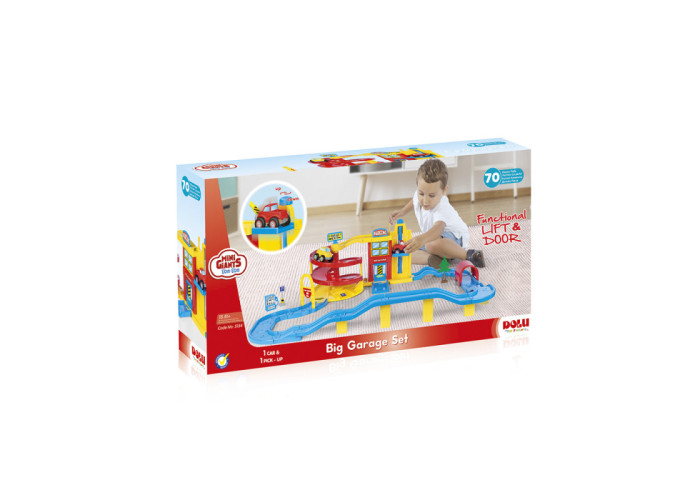 Крім треку та самого гаража в набір входять бензоколонка, дорожній знак, ялинка та 2 машинки. Бензоколонка має наклейку з номерним знаком та пістолет для заправки. Машинки являють собою 2 позашляховики з великими колесами. Вони мають просту форму із округленими краями, зрозумілу малюкам, пофарбовані у жовтий та червоний кольори. Дитині неодмінно сподобається спускати автомобільчики гвинтовим з'їздом та автотреком.