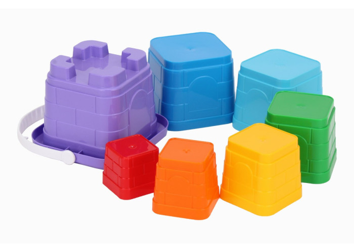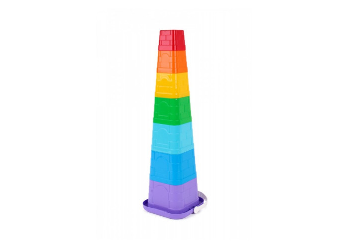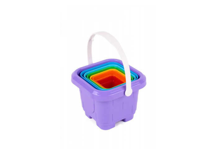 Яскрава пірамідка у кольорах веселки. Особливістю іграшки є те, що всі формочки можна скласти у квадратне відерко з ручкою. Таку іграшку зручно переносити, брати з собою на прогулянку, у пісочницю чи дитячий садочок.
