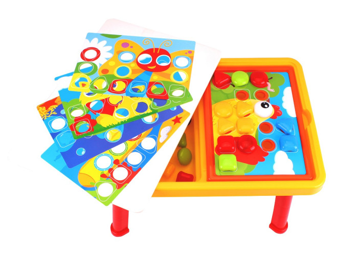 Ігрове поле Мозаїки зручно розмістити в одній із ніш столика, а трафарети та фішки в іншій. Так діткам буде цікаво гратися мозаїкою, адже всі елементи будуть завжди під рукою.